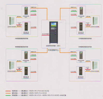 智能消防应急疏散知识系统主要由应急照明控制器,消防应急灯具专用应急电源(EPS)应急照明分配电装置和应急灯具组成,系统通过智能分配电装置提供DC24V直流电压,并通过F-BUS总线对灯具进行管理。